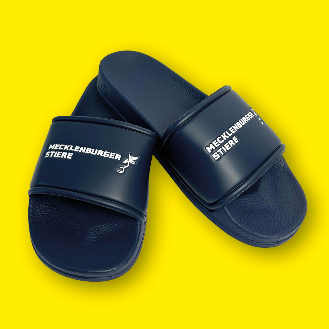 Badelatschen aus blauem Kunststoff mit weißem Aufdruck